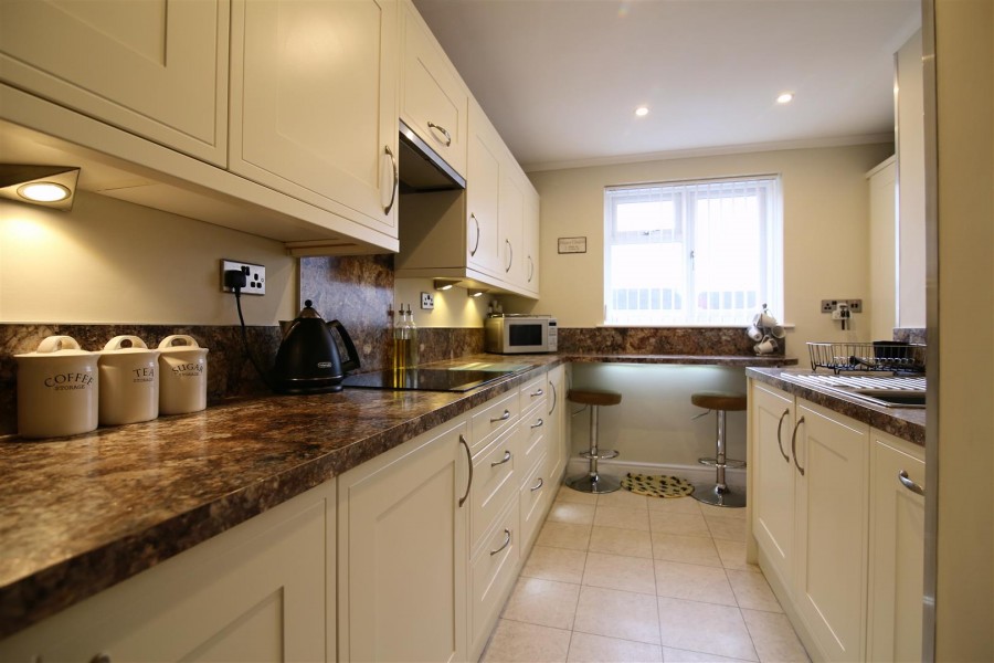 Stainless steel sink unit and drainer with inset slimline dishwasher under and mixer tap over. Range of base units, wall cupboards and Corian marble effect work surfaces. Breakfast bar. Ceramic wall tiling. Bosch induction four ring hob with extractor fan over. Built in electric fan assisted oven. Built in washer/dryer, fridge and freezer. Coving to ceiling. Inset spot lighting. Karndean flooring. Wall mounted gas fired combi boiler for central heating and domestic hot water. uPVC double glazed window to front.