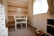 Range of fitted wardrobes and drawers providing hanging space and storage, top boxes with inset spot lights. Coving to ceiling. uPVC double glazed window to rear. Radiator.