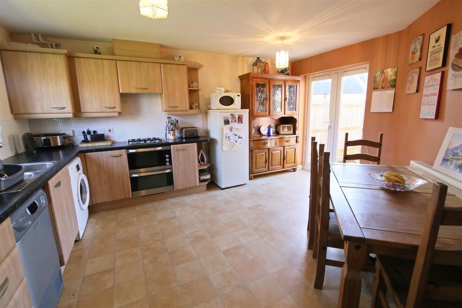 Two Upvc double glazed windows to front aspect overlooking the green. Upvc double glazed french doors onto rear garden. A range of eye and base level units with work top surfaces, inset one and a half stainless steel sink with drainer and mixer tap over. Built in four ring gas hob with extractor over and double electric fan assisted oven below. Tiled splash back areas. Space and plumbing for washing machine. Space for fridge/freezer and tumble dryer. Radiator.