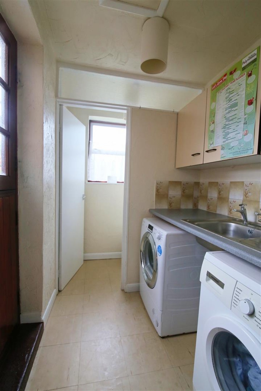 Wooden glazed stable door to rear garden. Eye level units with work top surfaces, inset stainless steel sink with drainer and taps over, tiled splash back areas. Space and plumbing for washing machine, space for tumble dryer. Door into: