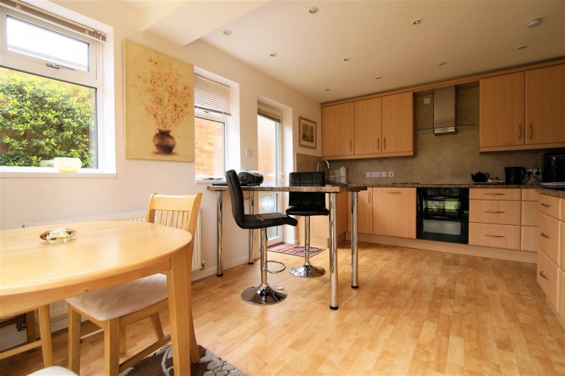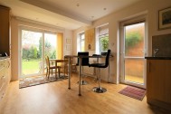 Two double glazed windows to side. Double glazed door to outside. Double glazed sliding patio doors leading to rear garden and patio area. One and a half bowl sink and drainer with waste disposal unit and mixer tap fitted over and base unit underneath, further base and wall units and work surfaces. Electric four ring hob and extractor hood. Double oven. integral dishwasher Breakfast bar. Tiled flooring. Radiator. Spot lighting. Two built in fridges and a built in freezer.