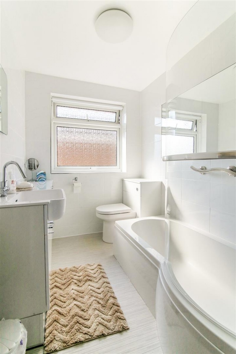 Newly re-fitted bathroom comprising: Panelled P Shaped bath with mains shower fitted and screen. Closed cistern WC. Vanity unit with inset wash hand basin and storage. Heated towel rail. Built in mirror. Large storage cupboard.