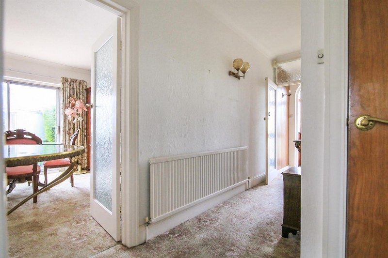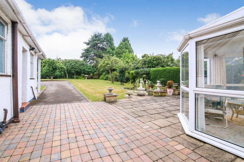 The bungalow is set back from the road and is laid to lawn with a block paved driveway leading to the side and rear of the property with access via double wrought iron gates.