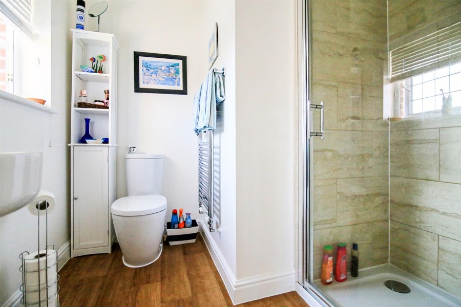 Upvc obscure double glazed window to the front aspect. A fully tiled shower enclosure. Low level w.c, wash hand basin. Heated towel rail, extractor fan.