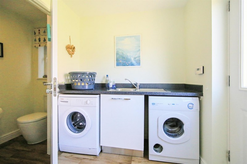 Obscure double glazed door onto the rear garden. Work top surfaces with inset stainless steel sink and drainer with mixer tap over. Space and pluming for washing machine and space for tumble dryer. Radiator. Door to.