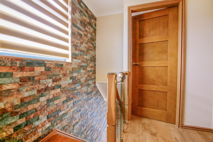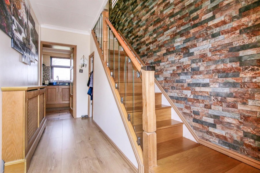 Enter via wooden obscure double glazed door. Laminate flooring. Oak stair case with glass panelling and feature wall. Radiator, door to understairs storage. Doors to: