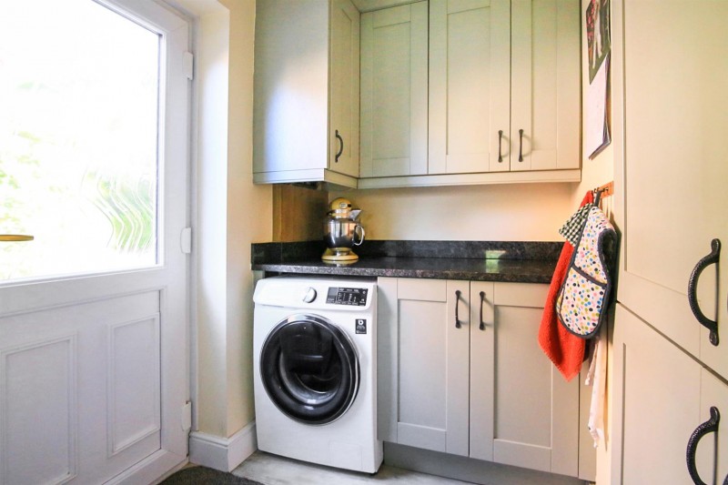 Range of base and eye level units. Granite worksurfaces. Built in fridge/freezer. Wall mounted gas central heating boiler. Plumbing for washing machine. LVT flooring. Door giving access to side of the property. Radiator.