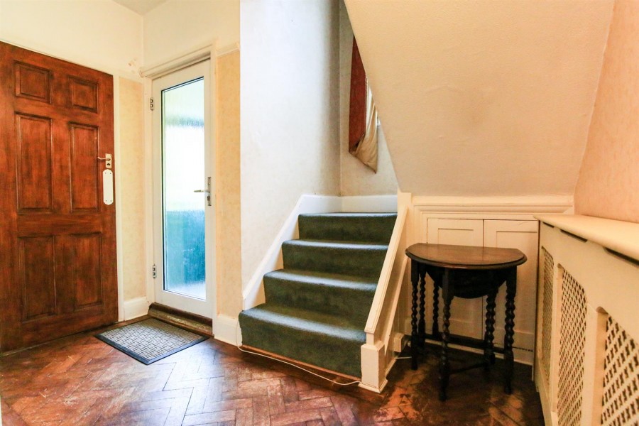 Enter via obscure double glazed door. Wooden parquet flooring. Dog - leg staircase rising to the first floor with feature stain glass window to the front aspect. Under stairs storage cupboard. Radiator, wall lights, picture rail. Door to: