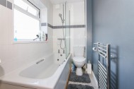 Upvc obscure double glazed window to the side aspect. A part tiled suite comprising: bath with shower fitted over. Low level w.c, wash hand basin. Heated towel rail.