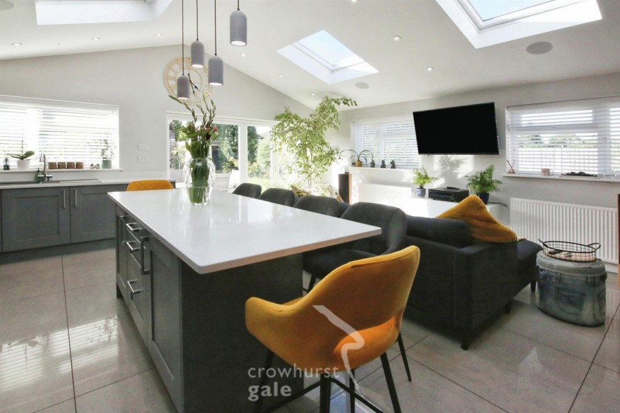 The current owners say this is the real hub of this home the Kitchen, Dining, Sitting space offers an opening through the Bifold doors out to the rear garden and plenty of light from the windows and four 'Velux' roof lights. The Kitchen area has an integrated dishwasher, fridge freezer, microwave, double oven and induction hob with extractor over, there is an island unit providing additional storage while also serving as a breakfast bar. There is a more formal Dining area off the kitchen which also leads through to the Study.