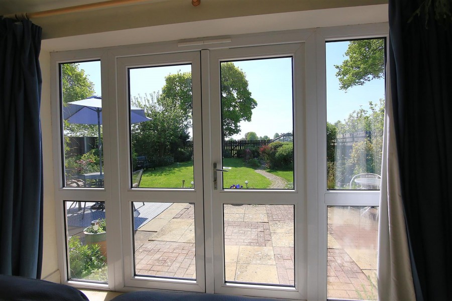 French doors leading to outside patio and rear garden. Cast iron, gas fireplace with wooden surround.